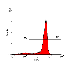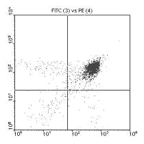 Two parameter histogram Dot Plot displaying FL1-FITC on the x axis and FL2-PE on the y axis.