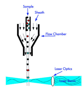 Introduction Flow cytometry uses the principles of light scattering , light excitation, and emission of fluorochrome molecules to generate specific multi-parameter data from particles and cells in the size range of 0.5um to 40um diameter. Cells are hydro-dynamically focused in a sheath of PBS before intercepting an optimally focused light source (See Figure 1.1). Lasers are most often used as a light source in flow cytometry.