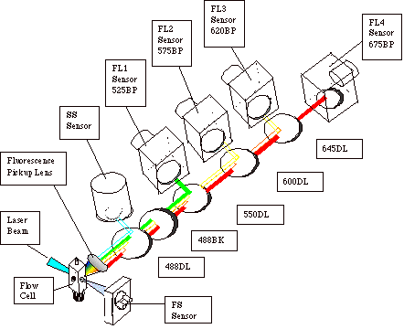 Flow Cytometry Analysis and Sorting Flow cytometry analysis of a single cell suspension yields multiparameter data corresponding to Forward Light Scatter (FLS), 90° Light Scatter (90LS), and FL1-FL4.