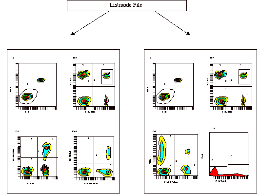 Once your data has been collected and written into a listmode file you can replay the file either using the specific Protocol used for collection or any other program specifically designed for analysis of flow cytometry data. However, you should keep in mind that you can only adjust Regions, Gating, and Parameters to be displayed. Settings such as amplification, fluorescence compensation, etc., can not be modified . Therefore, when collecting data make sure that your instrument settings are correct. Finally, if you open your listmode files using a programs such as FlowJo, WINMIDI, and/or ExPO you will have to specify parameter displays, and create Regions and Gating corresponding to the Protocol used for collecting the data.