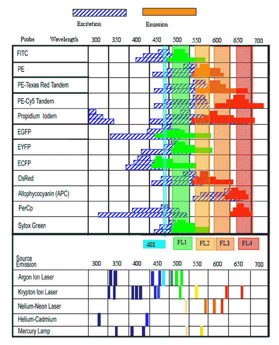 Table 1.1 Fluorescence spectra of commonly used fluorochromes. Excitation spectra is represented by the gray lines while emission spectra is in black. The bottom part of the table summarizes the emission wavelengths of various light sources used in flow cytometry. The 488nm line of the argon ion laser is extended over the spectra. (From Practical Flow Cytometry, Third Edition, Howard M. Shapiro. P. 245).